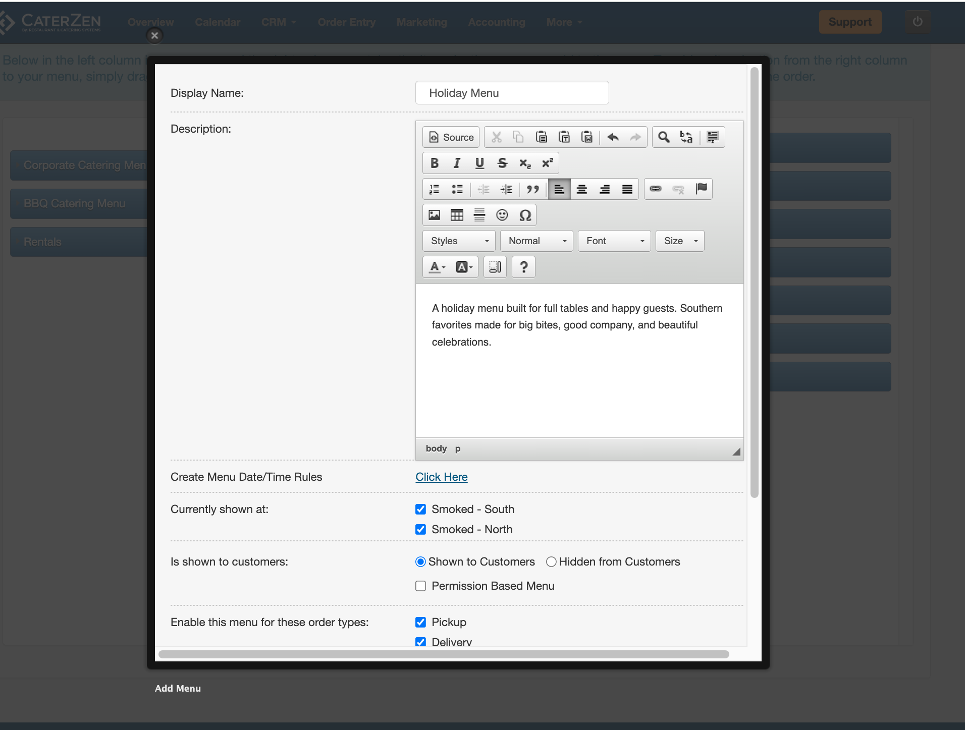Examples: Corporate Catering Menu, BBQ Menu, Holiday MenuDescription or HTML Editor: Add details or a short description for the menu here. You can type your own text or paste in HTML code.
