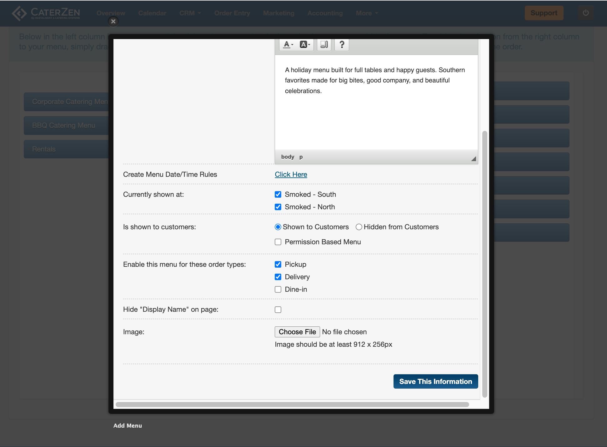 Enable This Menu for These Order Types: Check the order types that should have access to this menu. Order types control where the menu appears, such as Catering, Pickup, or Delivery.