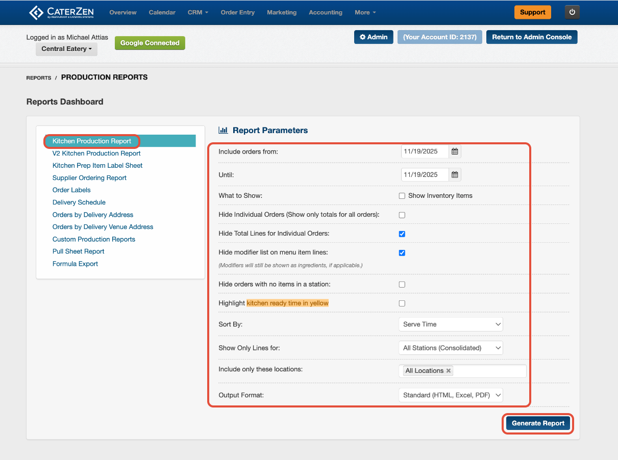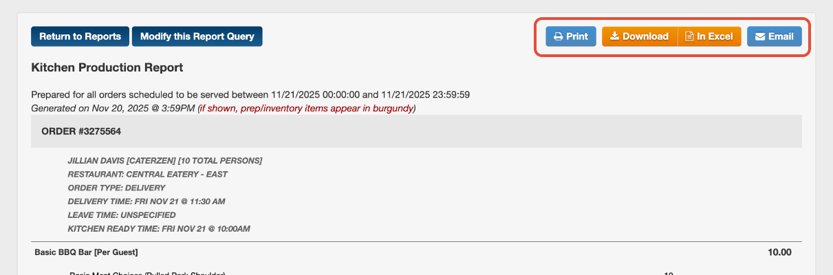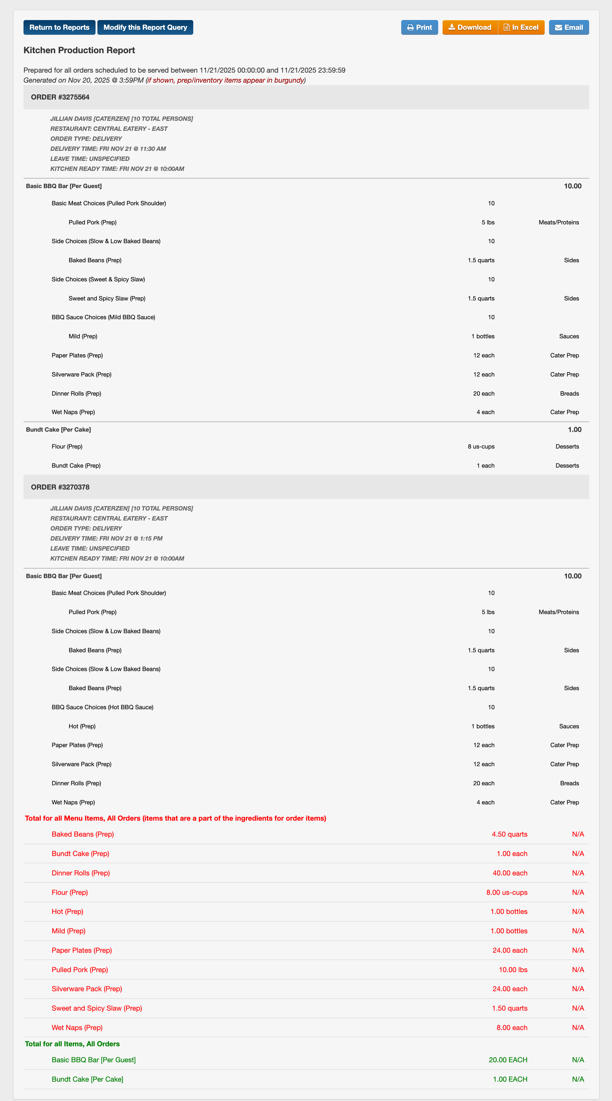 Use the Legacy Kitchen Production Report when you need the detailed breakdown of the menu items the Customer actually ordered plus the prep ingredients.