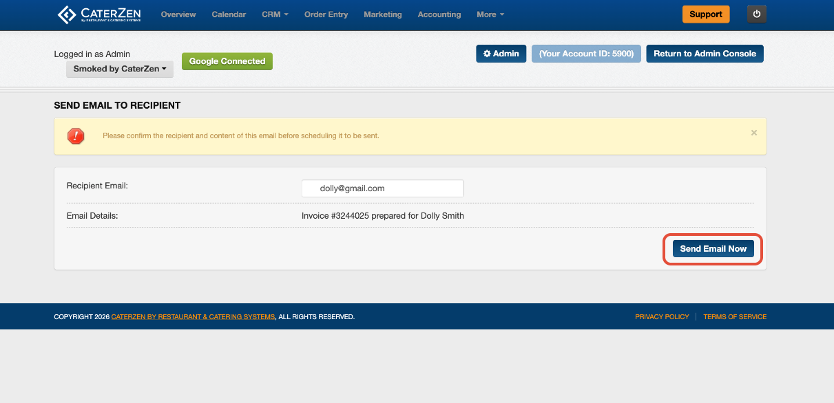- The customer's email will pre-populate automatically, but you can update it if needed. Confirm or update their email address, then click Send Email Now.