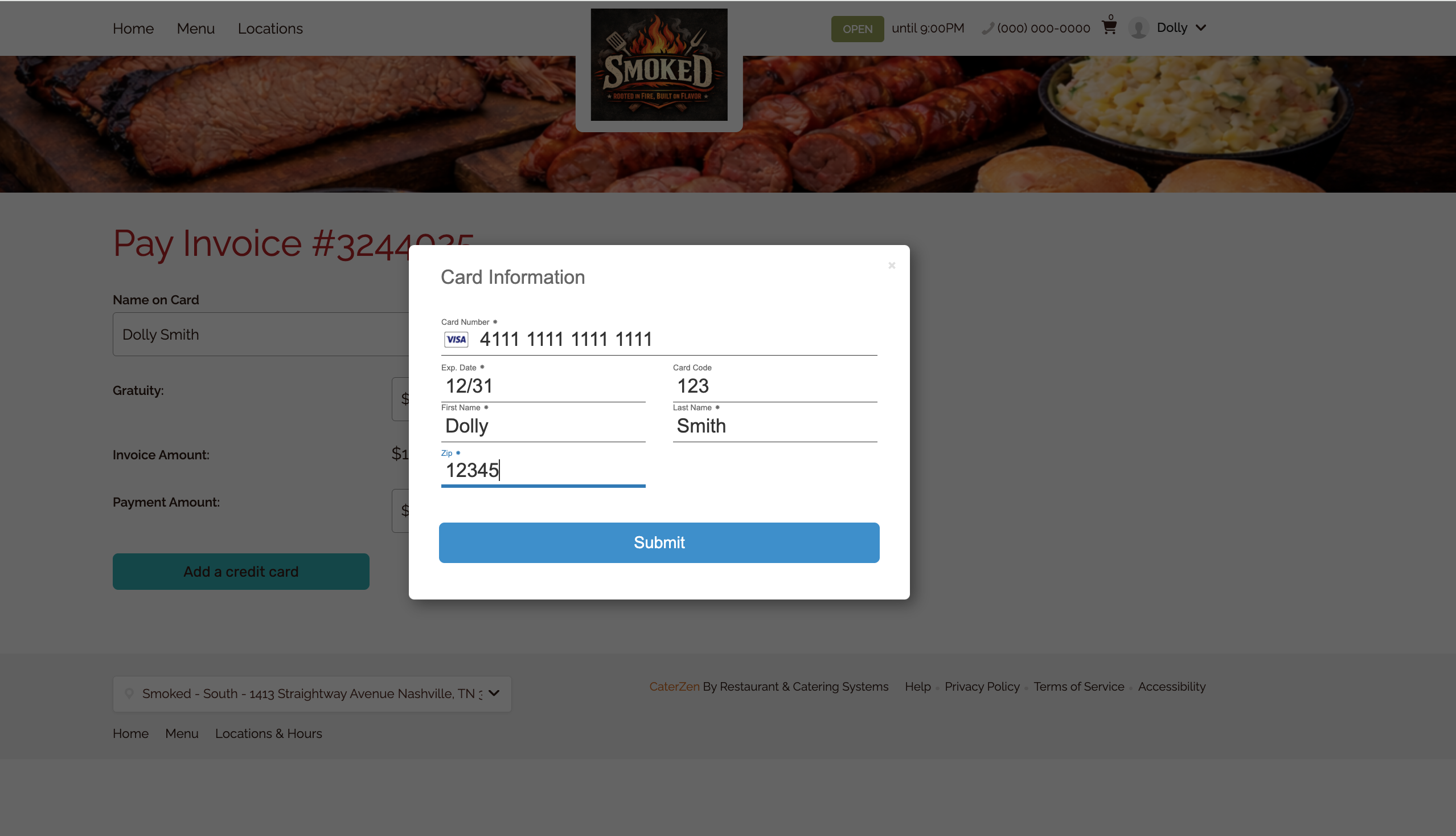 - The Customer can enter credit card information and click Submit